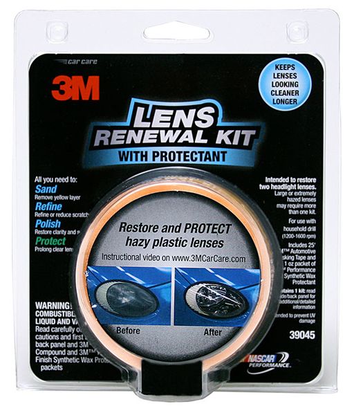 The 3M Lens Renewal Kit with Protectant is an easy and affordable way to repair your vehicle's plastic lens surfaces. The kit contains various graded sanding pads, pad holders, buffing pads, polish, protectant, detailed instructions and 3M headlight masking tape. It includes everything you need to restore the automotive problem of dull headlights. The Lens Renewal Kit with Protectant can also be used to repair hazing on other plastic surfaces, including taillights, emergency light bars, plastic motorcycle lights, trailers, snowmobiles and more. The 3M Lens Renewal Kit with Protectant is easy to use and can be performed by anyone. First, clean the plastic surface to be worked on and tape around the body panels of your vehicle using the included 3M tape. Second, using a drill (1200-1600 rpm) with an attached 3M backing plate, sand away the hazed surface in a two-stage sanding process with the included sanding pads. Third, refine and reduce remaining visible scratches using a drill, 3M backing plate and the foam disc. Fourth, polish and buff your lenses using a drill, 3M backing plate with orange foam compounding pad attached and a small amount of 3M headlight lens polish. Lastly, apply the protectant formula to seal out the elements and maintain crystal clarity. In addition to the drill, you will also need a spray bottle and water used in the wet sanding and buffing processes. Otherwise, everything that you need is included in the kit. The entire process takes under an hour, depending on the extent of the damage.