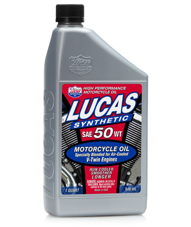 The Lucas Synthetic SAE 50W Motorcycle Oil is specially formulated with the finest base oils and exclusive Lucas high performance additives for all 4-stroke air cooled V-Twin / Opposed Twin / Slant Twin engines made after 1984. Lucas Oil has put all of its race bred technology into this oil to help your engine run cooler, smoother, and longer. Road testing indicates significant reduction in operating temperature.
