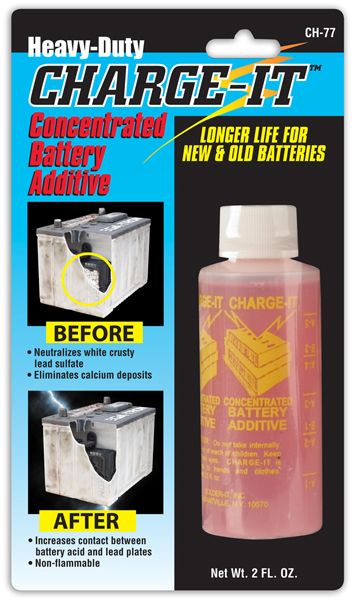 Charge-It is the only patented non-acid battery additive available. Guaranteed to restore, improve and prolong the life and performance of batteries.