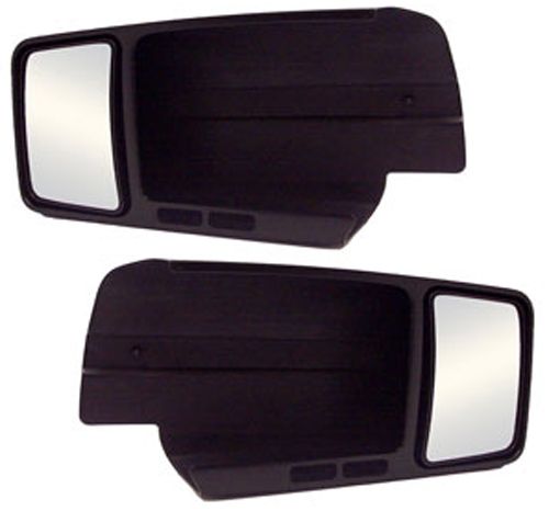 The CIPA Ford F-150 Custom Towing Mirrors were designed to fit over your Ford F-150's factory rearview side mirrors. The mirror is durable, aerodynamic, and sleeve fitted to your Ford F-150's specifications. The mirrors will slide snugly over your existing side mirror, and features an additional adjustable mirror on the outboard end that extends your towing vision, without obstructing your existing mirror. No tools are required, and no marks or holes are left on your Ford F-150. The mirrors and installation knobs are made with durable ABS plastic known for its strength, rigidity, and unbreakable security. The mirror face is made with OE grade glass which eliminates reflective symptoms such as ghosting and multiple images. The installation wedges are formed from a polypropylene plastic that has excellent long-term shape conformity, and provides years of installation reliability. The CIPA Custom Towing Mirrors can withstand the elements to provide increased all-weather towing vision capability.