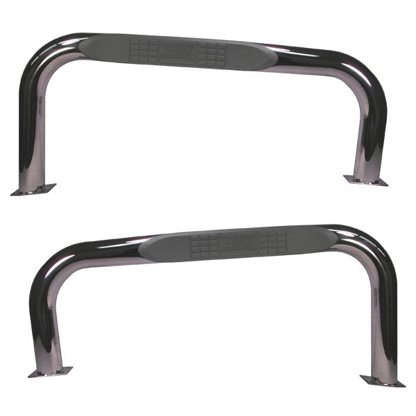 Complete the look with a set of tough duty side steps. Each side step is designed to be mounted to the frame of your Jeep creating a no-bounce secure fit. Each side step has a durable no-slip step pad that is specially mounted to the tube with rust-proof fasteners for long life and durability. The steps are e-coated steel with a polished stainless steel finish. Sold in pairs.