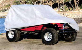 The heavy duty full cover weather barrier for the Jeep CJ & Wrangler is constructed of a new space age fabric that protects your vehicle from the elements while allowing the paint to breathe. The cover's soft and durable fabric pampers your paint finish and provides adequate protection against the sun, dirt, dust, moisture and pollution. Ultraviolet protection from the sun prevents heat buildup. It's unique diamond bond pattern allows damaging trapped air and moisture to escape, preventing paint deterioration. Spun bond polypropylene material is naturally water repellent. Features double stitched elastic hems for a custom fit and has grommets for use with optional lock and cable.