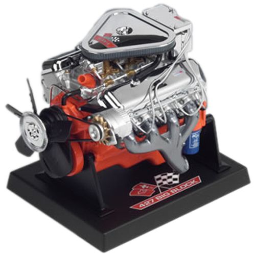 Authentic reproduction of the "Turbo Jet" 427 cubic inch displacement, 425 horsepower engine that was introduced in the late 1960’s. Factory part numbers are on the major components. The Chevy Big Block L89 Tri-Power die-cast engine starter motor gear drives the flywheel which turns the crankshaft, pulleys, pulley belts, fan and high performance ignition system.