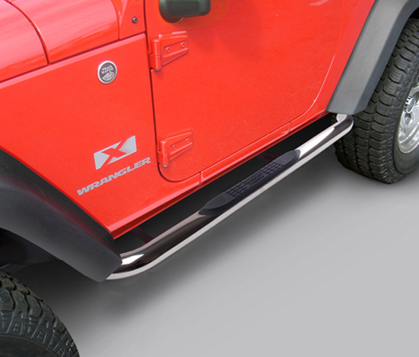 The Stainless Steel Tube steps for the Jeep Wrangler JK are custom designed for the oversized features of Jeep Wrangler JK. Unlike smaller tube designs, these large round tubes provide a much cleaner look and are not "dwarfed" by oversized tires and body style. The stainless steel tube steps feature prime 304L, �" wall stainless tubing polished to a mirror finish. The polishing process for the step is longer and deeper pulling out the deepest shine from the steel. Each tube step features a no-drill installation for ease of installation and a truly custom fit. All tube step installation brackets are constructed of durable 3/16" powdercoated steel for long life and years of flex-free use. Each Tube Step features special UV treated no-slip step pads with 5 mounting pins. These step pads are installed on top of the tube - no exposed metal to rust. Sold as a pair.