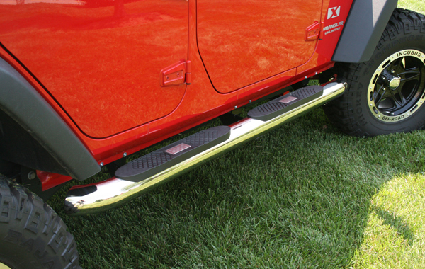 The Stainless Steel Tube steps for the Jeep Wrangler JK are custom designed for the oversized features of Jeep Wrangler JK. Unlike smaller tube designs, these large round tubes provide a much cleaner look and are not "dwarfed" by oversized tires and body style. The stainless steel tube steps feature prime 304L, �" wall stainless tubing polished to a mirror finish. The polishing process for the step is longer and deeper pulling out the deepest shine from the steel. Each tube step features a no-drill installation for ease of installation and a truly custom fit. All tube step installation brackets are constructed of durable 3/16" powdercoated steel for long life and years of flex-free use. Each Tube Step features special UV treated no-slip step pads with 5 mounting pins. These step pads are installed on top of the tube - no exposed metal to rust. Sold as a pair.