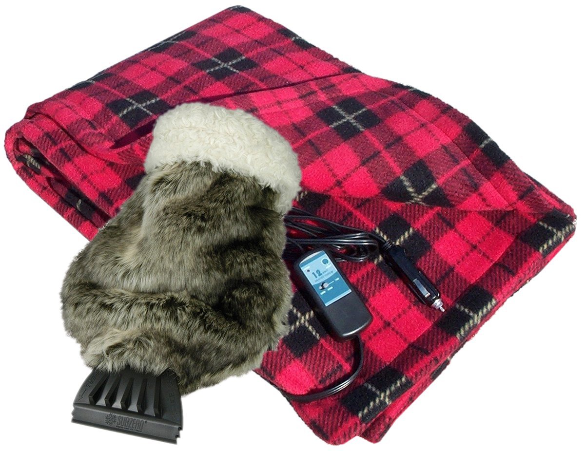 Set comes with a 12 volt heated travel blanket and fur ice scraper, both great for those cold winter days