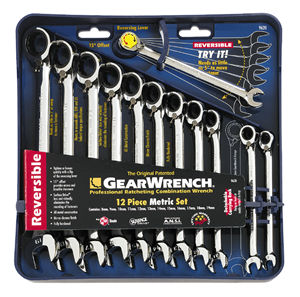 Twelve-piece metric reversible wrench/ratcheting combination set. Includes wrench sizes 8mm through 19mm.
