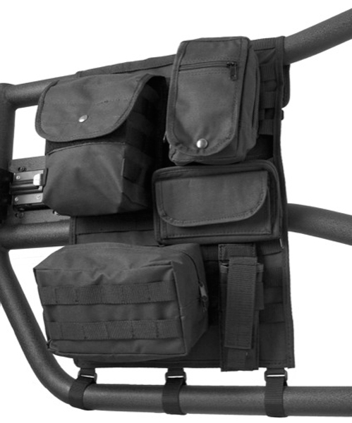 Add a fully adjustable Molle Pals storage solution to your Jeep Wrangler's tube doors. The Rugged Ridge� Tube Door Cargo Covers are made from 600 denier polyester fabric with a durable vinyl backing. Features an assortment of five different storage pouches with internal storage compartments. Fits Rugged Ridge and most other tube door designs.