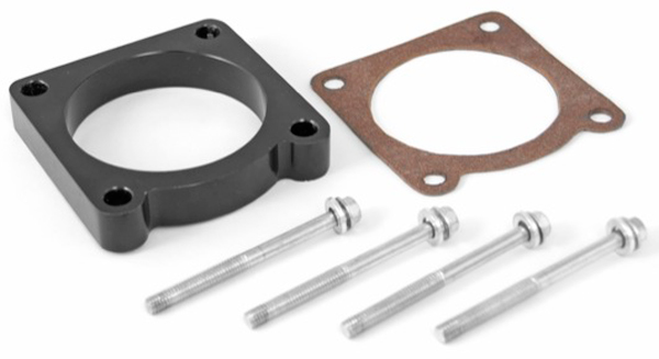 The Jeep Wrangler JK Throttle Body Spacer moves the throttle body �� away from the intake manifold. The move helps optimize power and performance by drawing in colder denser air. The large bore design allows your intake to inhale a larger volume of air producing more horsepower and torque. It features solid aluminum construction with a slick anodized black finish, and is a bolt on performance adder for 3.8L engines.