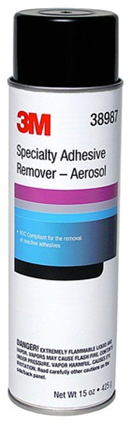 The 3M Specialty Adhesive Remover is an aerosol VOC compliant solvent-based specialty adhesive remover. It is designed to remove reactive adhesives from a variety of substrates. Reactive adhesives include adhesives that require a hardener or catalyst in order for the bond to occur. Examples of reactive adhesives include, but are not limited to: epoxies; urethanes; silicones. When properly used, it will not harm thoroughly dried paint, vinyl or fabrics.