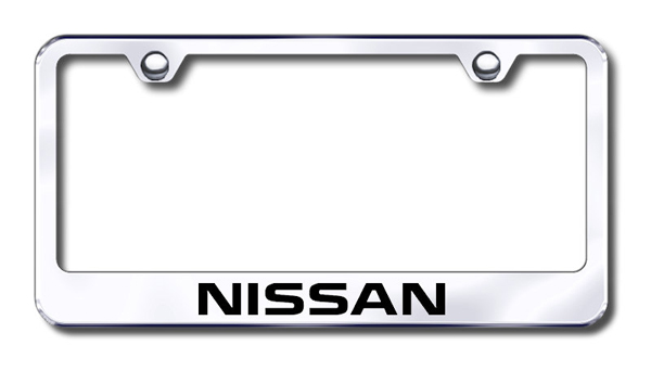 Laser-etched stainless steel license plate frame featuring Nissan lettering