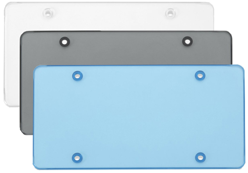 Clear plastic license plate shields available in clear, <font color="grey"><b>smoke</b></font>, or <font color="blue"><b>blue</b></font>