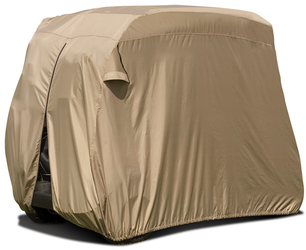 The Easy-On Golf Cart Cover by Classic Accessories protects your golf cart from sun, weather damage and dirt. With its tough water repellent fabric and rear air vents to reduce wind lofting and inside moisture, your golf cart will be protected in almost any weather condition. An elastic cord in the bottom hem provides a tight, custom fit. Comes with a storage bag for easy storage. The Easy-On Golf Cart Cover is an excellent low cost way to take care of your expensive toy! Cover works with a two or four person cart.