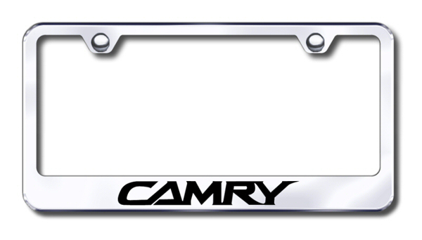 Laser-etched stainless steel license plate frame featuring Toyota Camry lettering