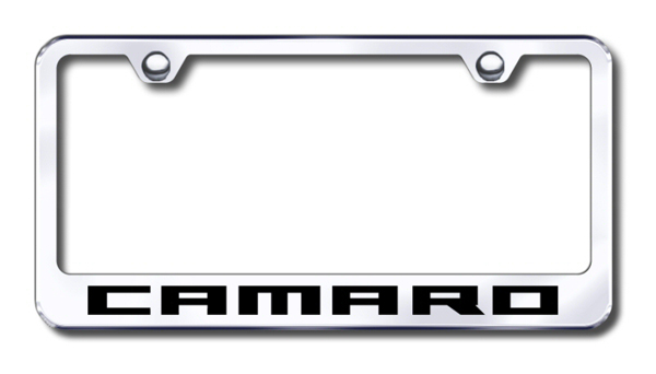 Laser-etched stainless steel license plate frame featuring <em>Camaro</em> lettering