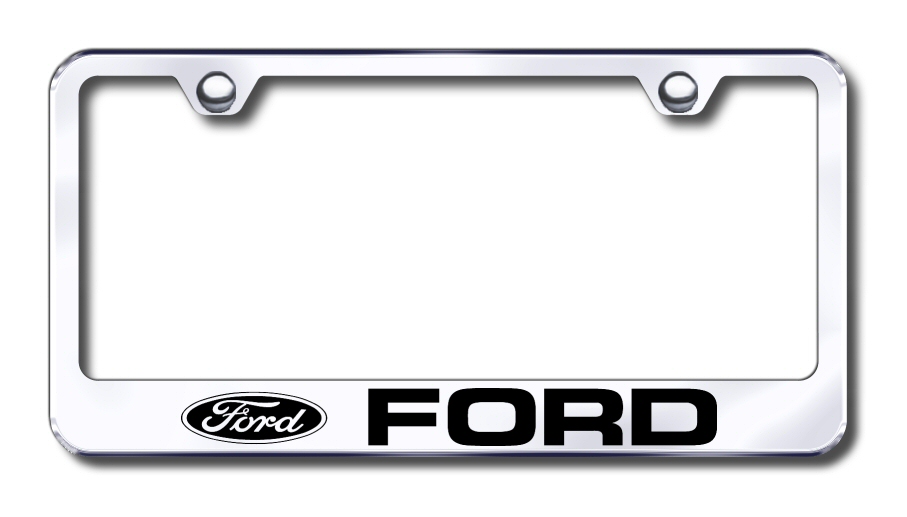 Laser-etched stainless steel license plate frame featuring <em>Ford</em> logo and lettering