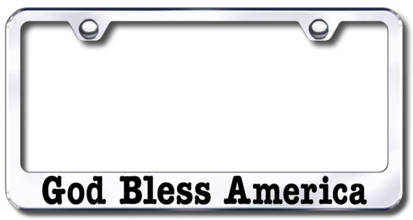 Stainless steel license plate frame featuring <em>God Bless America</em>