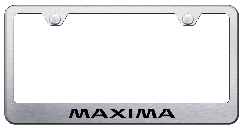 Laser-etched stainless steel license plate frame featuring Nissan <em>Maxima</em> lettering