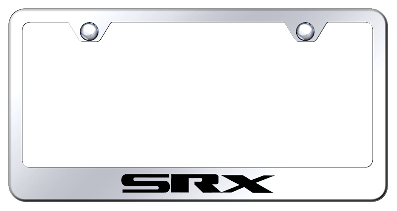 Laser-etched stainless steel license plate frame featuring Cadillac <em>SRX</em> lettering