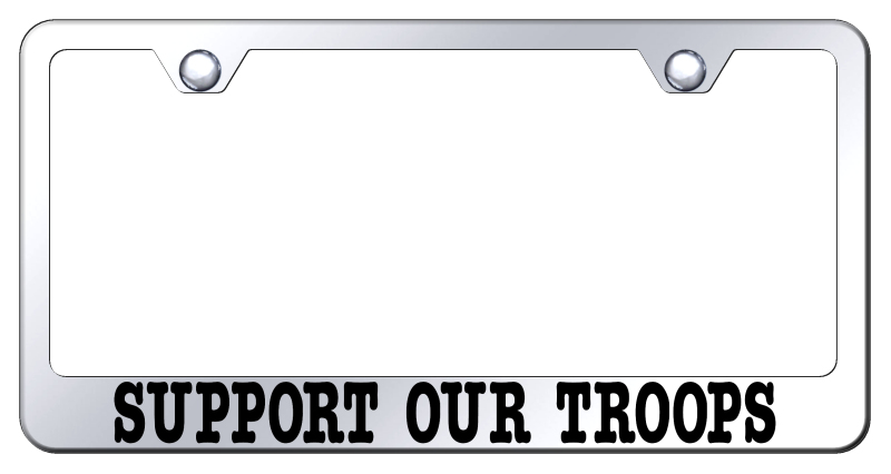 Stainless steel license plate frame featuring Support Our Troops