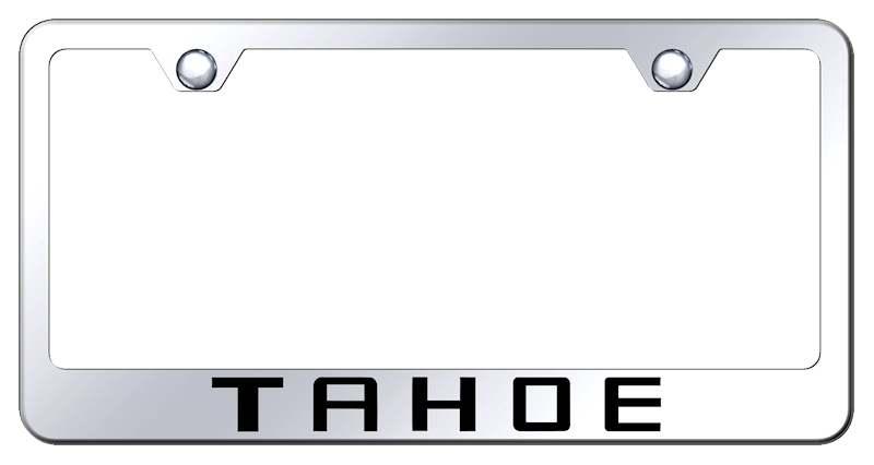 Laser-etched stainless steel license plate frame featuring Chevy Tahoe lettering