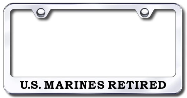 Stainless steel license plate frame featuring <em>US Marine Corp Retired</em>