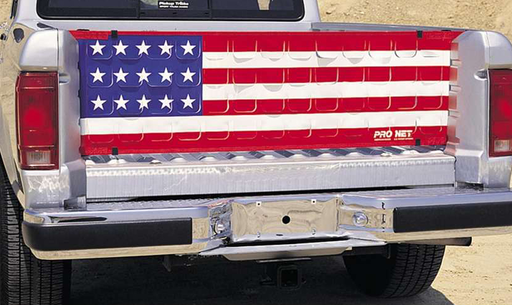 Every Pro Net features the patented high-performance, even-tensioning design that requires only four mounting holes to produce a perfectly flat, sag-free installation. Every ProNet is precision cut from heavy 22 oz. vinyl coated polyester, industrial quality "truck tarp" fabric, specially engineered to resist stretching and abrasion. The patented vent-cut design allows the nets to be silk-screened with an eye-catching, wall-to-wall, U.S. Stars and Strips design. The vents open and close while driving for gas saving air flow. The graphics are stainproof, washable and totally waterproof. The ProNet does not require the removal of the original tailgate and allows the use of both. With the tailgate down, the ProNet provides improved airflow and increased rear visibility. When required, proper cargo containment is quickly available with the tailgate closed. Comes with stainless steel mounting hardware. Constructed of heavy-duty 22 oz. vinyl-coated polyester fabric, with stainless steel mounting hardware.