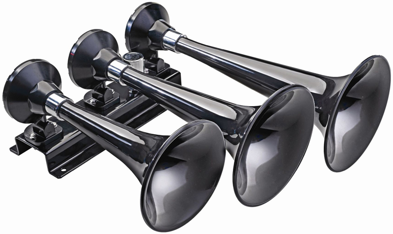 space than other styles of train hornsThree black trumpets made