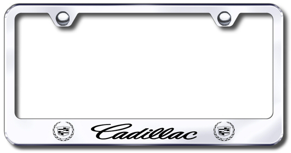 Laser-etched stainless steel license plate frame featuring <em>Cadillac</em> lettering
