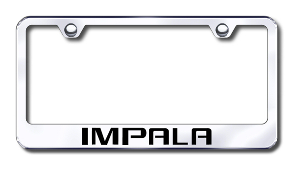 Laser-etched stainless steel license plate frame featuring Chevy <em>Impala</em> lettering
