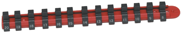The CTA 3/8" Drive-Metric Socket Rack features pre-printed socket sizes on the holders for easy identification. Each holder has a recessed spring ball to hold the socket. The rack includes a mounting hole for easy accessibility. Can hold up to 13 sockets.