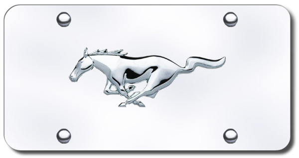 The Ford Mustang Logo License Plate is adorned with a 3 Dimensional chrome, Ford Mustang logo, mounted on a polished stainless steel plate with an eye-catching mirrored finish. Each plate comes with vehicle specific hardware, matching screw caps to conceal unsightly hardware and a lifetime warranty against flaws in materials and workmanship. Made in the USA