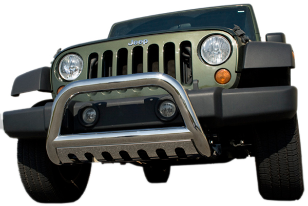 The Jeep Wrangler JK Stainless Steel Bull Bar featurea prime 304L, 1/2" wall stainless tubing polished to a mirror finish. The polishing process for the Bull Bar pulls the true shine out of the metal. By using only prime 304L stainless steel, the Bull Bar will never rust, providing years of use and great looks. The Bull Bars feature a no hassle installation. Each Bull Bar is custom fit for the specific vehicle making sure the mount points are the strongest available. Tough 3/8" - 1/4" powder coat painted mounting brackets and oversized hardware ensure that the Bull Bar provides years of vibration free use. Each Bull Bar includes a matching skid plate for added protection and dynamic good looks. Each skid plate is laser cut to ensure clean smooth lines and a no hassle installation.