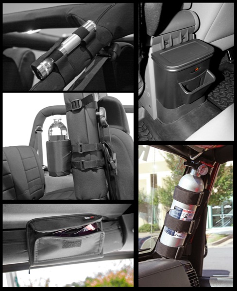 The Jeep Wrangler JK Black Interior Storage Kit includes: a fire extinguisher mount, roll bar cup holders, a sun glass holder and a rear seat organizer.