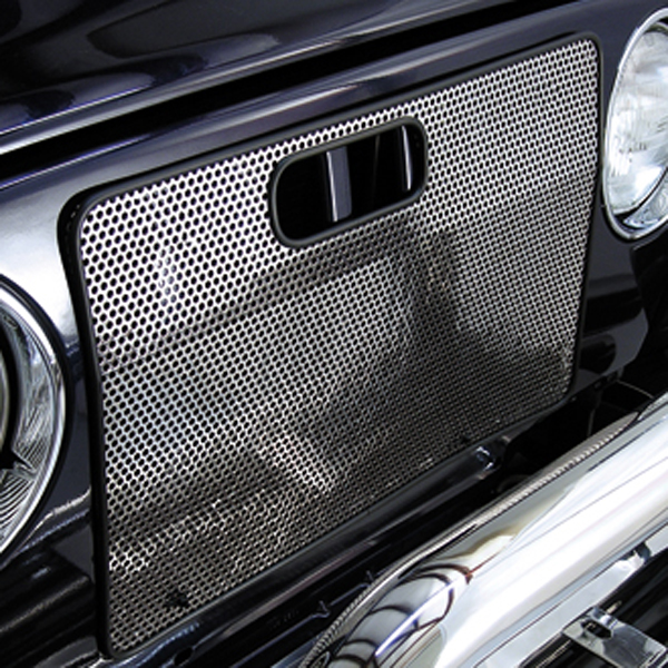 Protect your Jeep Wrangler's front grille from bugs and debris with this durable radiator bug shield. Each externally mounted bug shield is constructed of stainless steel, perforated for unencumbered air flow, and is bound by soft rubber to prevent vehicle scratching. Installation requires some drilling.