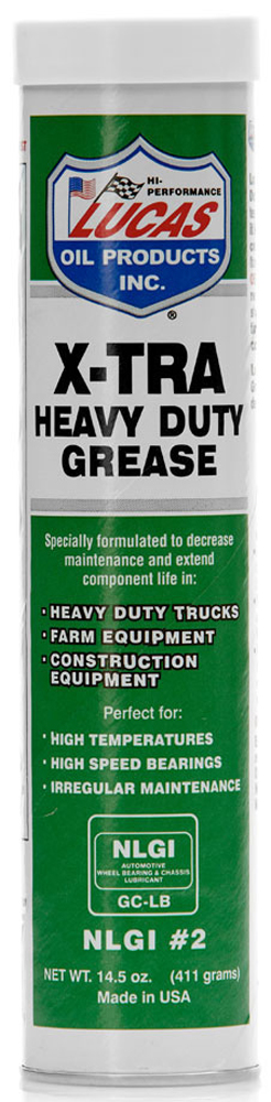 Virtually wash-out proof. Stands up to high temperatures and stays soft in very low temperatures. EP fortified and exceeds OEM specifications. Lucas X-Tra Heavy Duty Grease was formulated for automotive, agricultural, heavy-duty and industrial applications. It is virtually waterproof and is more stable than all conventional lithium grease. It is fortified with an extreme pressure additive package and it exceeds OEM Lube for Life specifications.