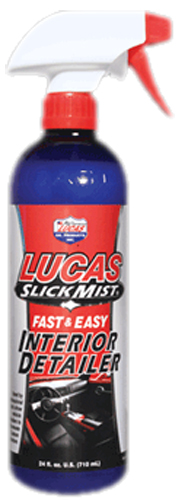 Lucas Slick Mist Interior Detailer is an environmentally friendly detailer spray exclusively formulated by Lucas Oil Products designed to clean and protect like nothing you�ve ever used. Spray as needed onto interior surfaces such as plastic, vinyl, leather, rubber, and metal for a �like-new� look. Cleans and protects steering wheels, dashboards, seats, consoles, doors, and trim. Also works great on household furniture.