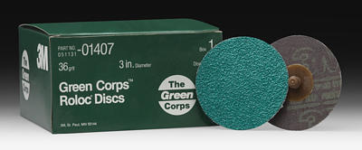 3M Roloc 1407 Green Corps 3" Roloc Discs. Generally used for hard to reach areas in paint, rust, and weld removal. Handy quick change tool for disc grinding which fits any standard 1/4 in drill or air tool. Brown button.