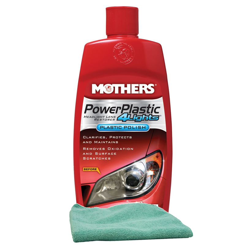 Mothers PowerPlastic 4Lights Plastic Polish is specifically formulated for use by hand or with the PowerBall 4Lights polish tool. Allows you to quickly and easily polish and protect a wide variety of hard or flexible clear plastics in one simple step. It features a special blend of oxidation inhibiting polymers, UV shields and an ultra-fine polish that work in unison to clean and clarify your headlights, taillights, convertible top windows and more. Contains 8 fl. oz.