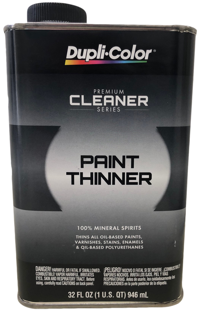 The Dupli-Color Paint Thinner is made from 100% mineral spirits. It thins all oil-based paints, varnishes, stains, enamels, and polyurethanes. Cleans dirt and grease from surfaces prior to painting, staining or finishing and allows paint to bond better to the surface.