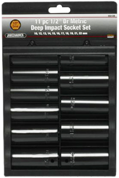 The Performance Tool 11-Piece 1/2-Inch Drive Metric Deep Impact Socket Set is constructed of tough chrome moly steel with a black heavy duty industrial finish that can take the punishment of daily use.