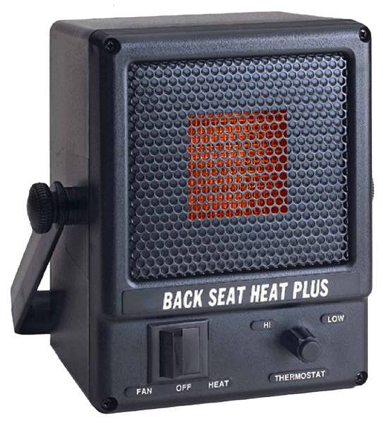 The 12 Volt Back Seat Portable Heater is ideal for heating those always cold areas in your car, RV, van, boat, trailer, or cab. This compact heater heats up instantly, providing over 1100 BTUs of heat. Features an adjustable thermostat so you can control the amount of heat, plus an optional dash switch so you can easily turn the heater on or off. The heater is powered by a direct hook up, it does not plug into cigarette lighter. The heater connects with an included 20 foot wiring harness and will draw 300 watts (the average home hair dryer draws 1000 watts). Carries a two year warranty by manufacturer.