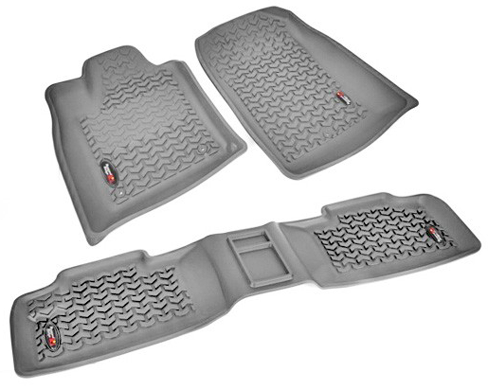 This is not your typical floor liner! Existing floor liners in the market today are constructed of extruded plastic materials vacuum formed to fit the vehicle. Rugged Ridge has taken a completely different approach to floor protection. Each All Terrain Floor Liner is injection molded for superior fit and quality. The injection molded process, though more expensive to develop, allows us to create a floor liner that has exacting measurements or better fit and finish along with a deeply formed perimeter wall for maximum coverage. Each All Terrain Floor Liner has chevrons that are up to 3/8� deep. That is up to 3 times the depth of other floor liners! The chevrons keep water from sloshing and help divert mud water and snow away from the driver's pant leg. We call this true �Deep Tread Technology�! Set includes two front floor mats and 1 rear mat.