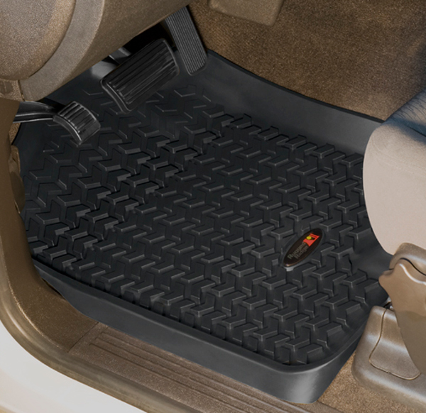 This is not your typical floor liner! Existing floor liners in the market today are constructed of extruded plastic materials vacuum formed to fit the vehicle. Rugged Ridge has taken a completely different approach to floor protection. Each All Terrain Floor Liner is injection molded for superior fit and quality. The injection molded process, though more expensive to develop, allows us to create a floor liner that has exacting measurements or better fit and finish along with a deeply formed perimeter wall for maximum coverage. Each All Terrain Floor Liner has chevrons that are up to 3/8� deep. That is up to 3 times the depth of other floor liners! The chevrons keep water from sloshing and help divert mud water and snow away from the driver's pant leg. We call this true �Deep Tread Technology�!