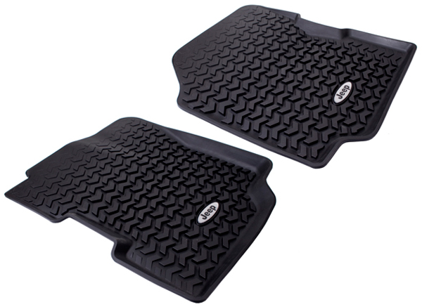 The only floor liner with patent pending Deep Tread technology! These floor liners are a totally new concept that combines all the best features of precision engineering using state of the art a deep ribbed floor mat and the old style liners. Precision engineering using state of the art technology ensures an exact fit to the shape and contour of your vehicle�s floor. The deeply molded Chevron-shape tread pattern channels dirt, mud and snow away from the driver to keep shoes and pant legs clean, containing the movement and sloshing around of any trapped water. The high perimeter wall offers a large footprint and maximum interior protection and containment. Constructed of all weather injected-molded durable OE-quality Thermo- plastic Elastomer (TPE). Raised nibs on the bottom provides maximum retention and keeps the liner in place. The self-sealing floor hook attachment feature (where applicable) helps to prevent dirt and moisture from getting through. Easy to remove and clean. Simply hose them off and go!!! The mat actually reseals itself around the hook! Each floor liner comes with a Mopar licensed Jeep logo on it. Sold as a pair.