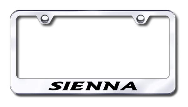 Laser-etched stainless steel license plate frame featuring Toyota <em>Sienna</em> lettering