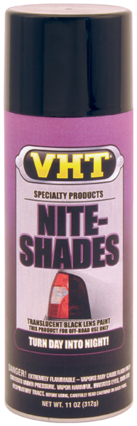 VHT Nite-Shades� is a transparent black tail light lens coating for creating a custom European styling. When applied to tail lights, fog lights or turn indicators, VHT Nite-Shades� appears black until they are lit, then the natural red color appears. Recommended for off road use. Warning: Once applied to plastic lens, it is not able to be satisfactorily removed.