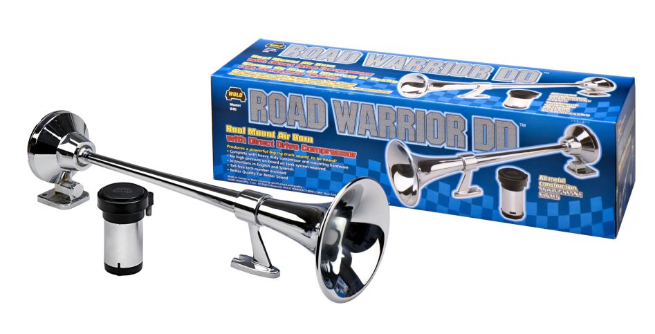 The ROAD WARRIOR is a powerful air horn that will produce the same high output sound that a big rig truck demands. The beautiful chrome finish will look great on any truck, RV, van and etc. Powered by Wolo's new compact heavy-duty compressor that is maintenance free. No high pressure on-board air tank required. The horn is secured to the vehicle's roof with two (2) sturdy mounts that will eliminate vibration at high speeds and while driving on rough roads. Installation is made easy with Wolo's new flexible inlet hose with brass fittings. The ROAD WARRIOR will provide years of dependable maintenance free service. Kit includes heavy-duty compressor, relay, hose, stainless steel mounting hardware.