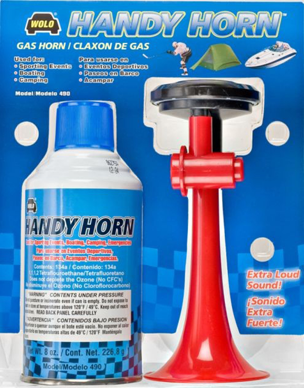 Extra loud hand-held horn. Comes with a 10 oz can of eco-friendly gas