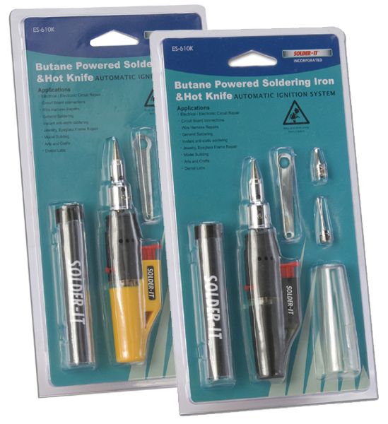 The Solder-It™ Soldering Iron and Hot Knife, includes a soldering tip with a temperature range between 400 degrees F and 500 degrees F. The blow torch function reaches 2,400 degrees F. Operating time for one fill is 20 minutes. Available in yellow or black.